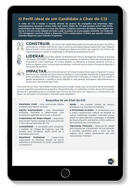 Se você já teve sucesso empresarial e deseja ajudar empresas centradas em Cristo a impactar o mercado, tornar-se um Chair do C12 pode ser seu próximo passo! Quer aprender mais sobre o que significa construir um Grande Negócio para um Grande Propósito? Baixe nosso E-book e nossos recursos para se informar sobre esse papel.